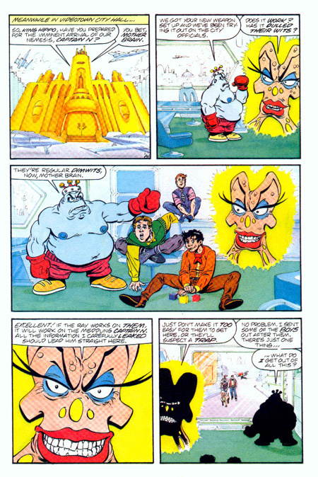 Don't they mean, "Meanwhile, at Bespin's Cloud City?" Having an airstrip on the front yard isn't as great an idea today as it was back whenever this comic was made. Of course, Videoland is a metropolis without strife, persecution, or that unpleasant deserty region of Asia where people kill each other because a cloth with writing on it told them to. Sprites are without sin. You might notice in the third panel, former Nintendo guy Howard Phillips (of Howard and Nester fame) has been reduced to a Special Needs case. Actually, that's just after RARE kidnapped him and stole part of his diabolic mind for the code to Battletoads in Battlemaniacs. Oh, and Mother Brain needs closeups like Jewel needs albums. |