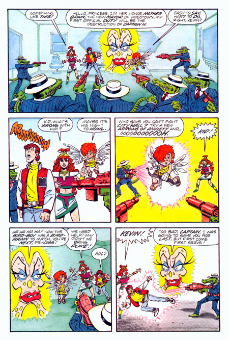 Duke does a good job of faking it as leader, and successfully leads him into the trap. Distressed, he howls and gets shot by the Stupid Ray. To no effect, of course (It doesn't work on dogs. I know it isn't just a matter of him being stupid to start with- he's easily the smartest of the team.) Kid Icarus threatens to do something, but is turned into a slobbering fool by the terrifying, badly-drawn super weapon. "Arrows of Anxiety?" If you ever doubted the powers of Green Arrow and his stupid trick arrows, remember his arrows are a little more potent than having the power to cause mild agitation. Kid Icarus also has Arrows of Mellowness, Mild Concern, and Melancholy. For crying out loud, if they were just normal arrows, they'd be more dangerous! |