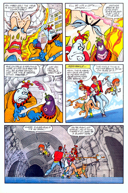 me back up. In the fourth panel, they actually seem to have warped into someplace that hadn't been drawn yet. Kid Icarus also seems to have switched which hand he shoots the bow with again, while Lana points her stick at nothing, attempting again, to look like she has powers. Eggplant Wizard's still the stupid one, so I guess it stays this way for the the rest of the comic. I thought he was supposed to be the smart one for the simple fact he doesn't take blows to the head for a living. Although there was one time in the cartoon where Mother Brain told him to make her an apple, and he turned her into one. You might also notice the obvious flaw in their version of Metroid, and that's the fact there's a straight hallway. The floor isn't missing, and no platforms are floating overhead. Of course, there's also the fact the writers seemed to think 'Metroid' was Mother Brain's spaceship, and that Mother Brain was an enormous fleshy skinflap who lived in a light bulb. |