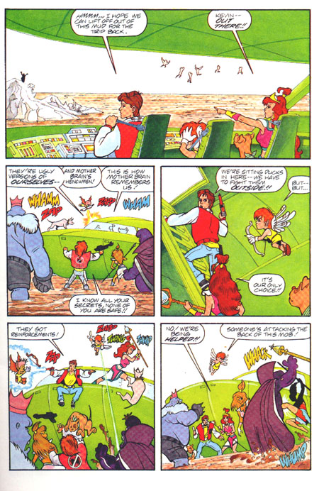 This page marks the first appearance of the 'furry' Kevin and Lana. Not suprisingly, they're evil. They're infinitely more creative looking than the other evil twins, especially since the Eggplant Wizard simply looks more like he does in the game than ever. Captain N leaps off the ship while throwing his arms into a mighty Fonz-like shrug. "Eeeeeeey! They got reinforcements!" Then the laugh track goes off. I especially like the scene they have there where Kid Icarus fires an exploding arrow into the ammo dump hidden in the evil Eggplant Wizard's crotch. Only you can prevent groin fires.
