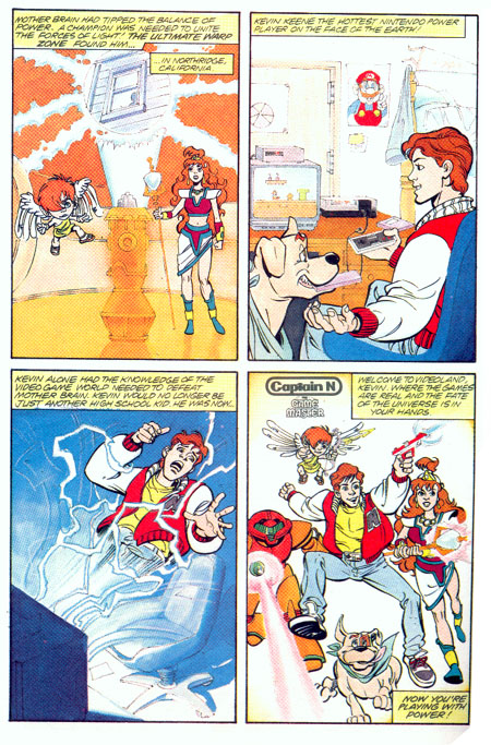 bringing him a chocolate-chip granola bar. But even his Jerrold cable converter box and wall-mounted pie chart (undoubtedly showing how good he was at nintendo) couldn't save him from his destiny- to spend the rest of his life helping video game characters kill other video game characters. Notice in the last panel, they add a glowy effect on Lana's wand. This was done to make it appear she had some sort of useful talent, like fireball summoning or more likely, having low starting HP and lots of healing spells. In reality, Princess Lana's powers are limited to standing behind Captain N and delivering occasional exposition. I hear after he saved Videoland and returned home, he went on to be murdered by one of those fanatical Dungeons and Dragons clans. |