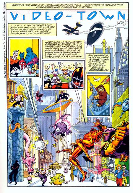 | I've been to Video Town before. They were the local video store before Blockbuster commandos broke down the storefront and performed an End of Evangelion-like mass execution. Not that it mattered; they both had the same stock of tapes, and were both insanely overpriced for a three day rental. Of course, these days you can only rent movies that came out yesterday, but they have a jillion copies of them and you get them for five whole days. I'm thoroughly convinced that the producers of the Captain N cartoons and comics had never played a video game in their lives. They did things like pit Bayou Billy against Dr. Wily, mistake the two separate Belmonts of Castlevania for one person, and painted Megaman green. Everything else just seems to have been made up pretty much at random. There's a ninja, some guy with a pair of guns, a gay mobster getting tossed into a lightpost, and for some reason the Parthenon is in the downtown area. But the most famous made-up character of all has to be Rex Dart, Eskimo Spy, star of the smash hit Gamera series. We see him surfing on top of a hovercar, shooting an odd purple demon in the ass. |