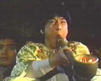 dressed like some sort of Mexican tramp/commando sing and laugh with