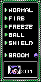 There's also the fact that you start out the game with all her spells in the menu (which, of course, was ripped straight out of the first Mega Man) which saves you the trouble of hunting down gimmick-based Robot Masters. NORMAL gives you the ability to do anything you usually could. Like run, jump, get squished, or shoot energy orbs from your wand. And, in a totally innovative fashion, you can hold down the fire button for a bigger blast. Man. FIRE turns you into a Phoenix, obliterating everything onscreen. which would be a great attack except it works on you, too. I'm serious, it cuts off half your bloody life bar. I've yet to figure out what FREEZE has to offer beyond NORMAL besides turning you blue. Maybe later on in the game, you'll be fighting a TV weatherman from Krion with a machine gun and the head of Megumi Hayashibara, and you can quickly turn 'invisible' behind the weather map's bluescreen effect. BALL is bouncy and fun to play with. DOG is especially weak against BALL. SHIELD summons Nick Fury to tell kids to stay off drugs and to treat themselves to a Hostess Pie after they're done playing this game. And finally, BROOM invokes the time-honored mode of transportation for witches, mages, and substitute teachers. The only catch is, it likes to just randomly vanish on you. Usually over spikes. Which, just like in Megaman, instantly explode you.