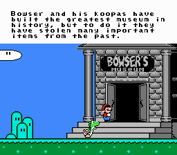 the opening screen, where Mario rides Yoshi up to the Koopa museum (a